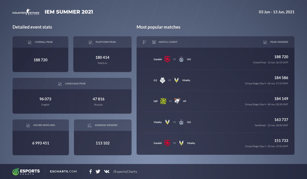 Although the numbers went down again towards the tail end of 2020 as no large scale competitions were held, the Champions Tour saw the return of the audience with a vengeance. Up to 750,000 viewers followed the first interregional clash at the VALORANT Masters in Iceland. Some of that was also due to the Co-Streaming concept on Twitch, which enables popular streamers to watch the matches with their communities while still contributing to the viewer count.